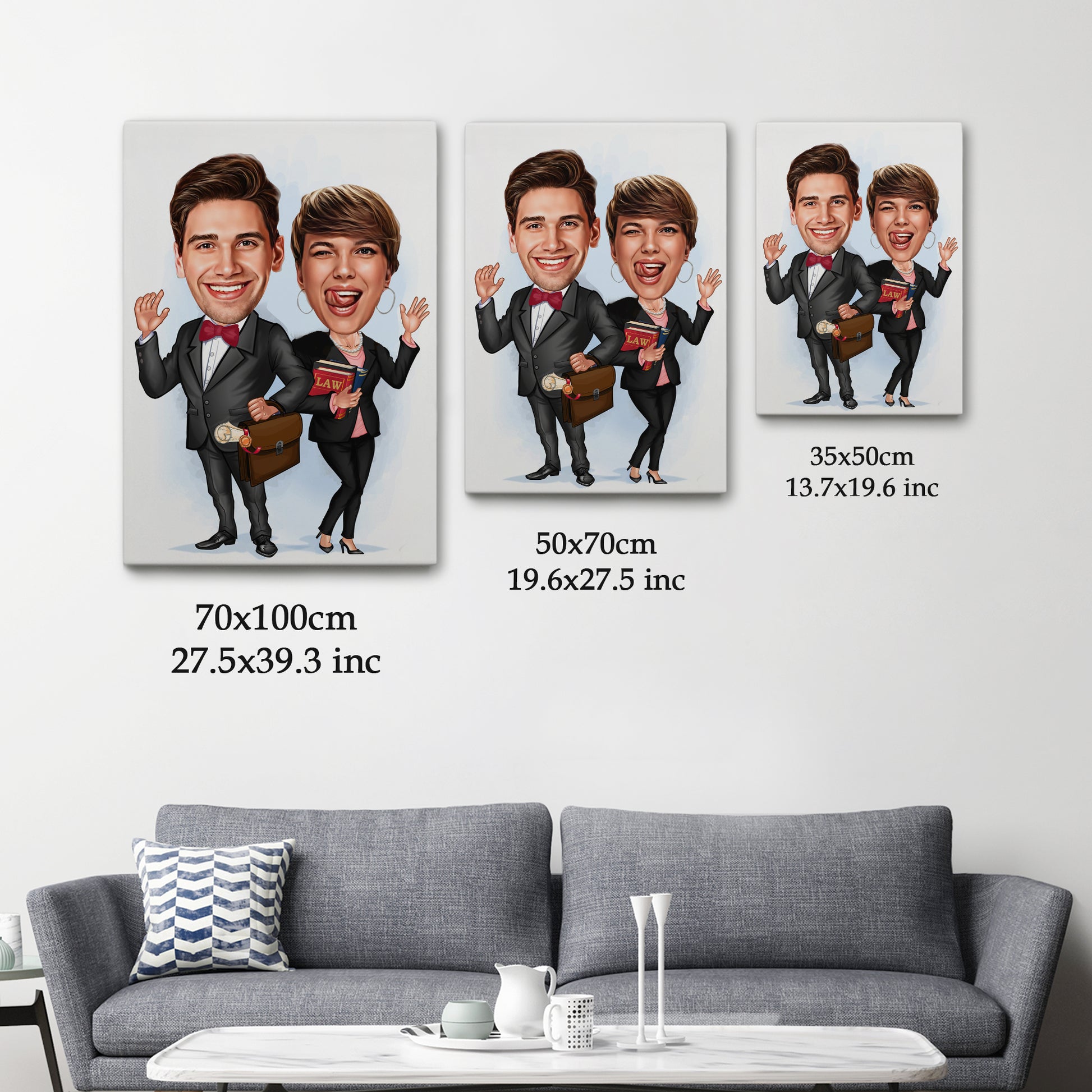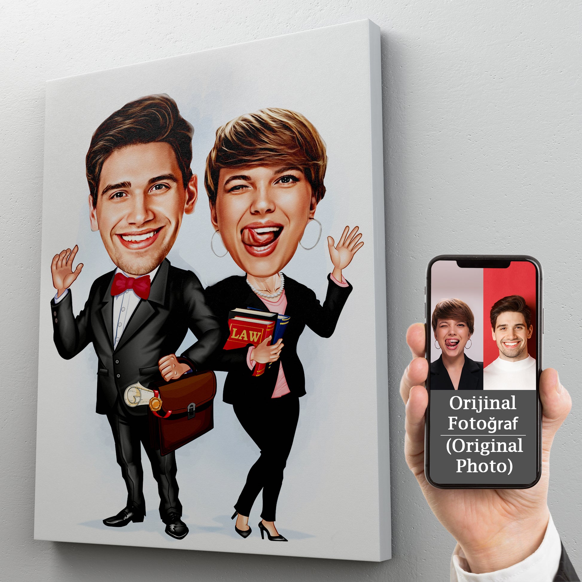• Fotoğraf Bazlı Tasarım: Sipariş verdiğinizde size bir form gönderiyoruz. Formda fotoğrafınızı yükleyeceksiniz ve bizim grafik tasarımcılarımız sizin fotoğrafa göre hukuk temalı bir karikatür oluşturacaklar. Her detay özgün olarak çizilecek!